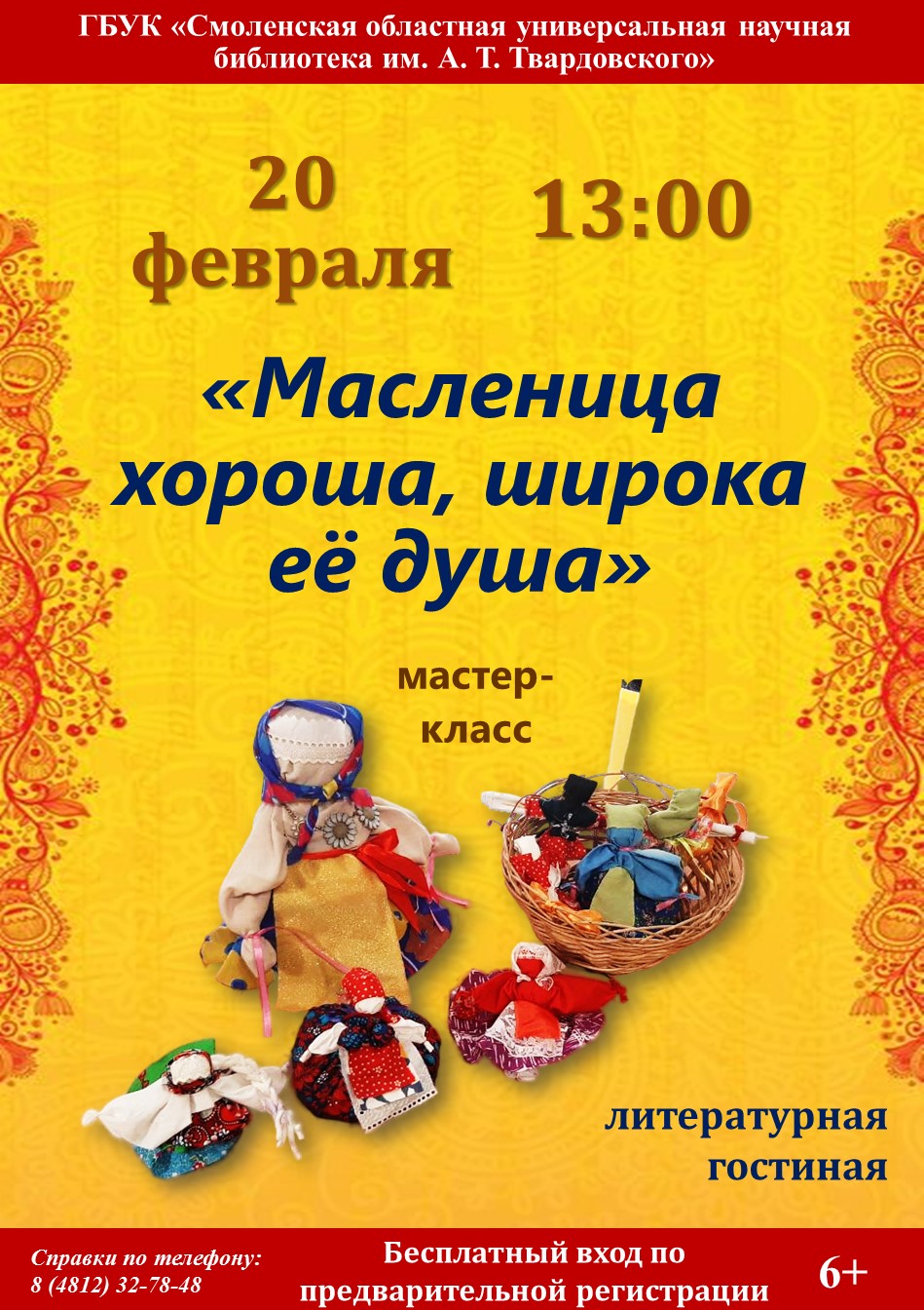 Областная библиотека им. А.Т. Твардовского организует праздничное мероприятие «Масленица хороша, широка ее душа!», которое состоится 20 февраля в 13:00 в литературной гостиной.