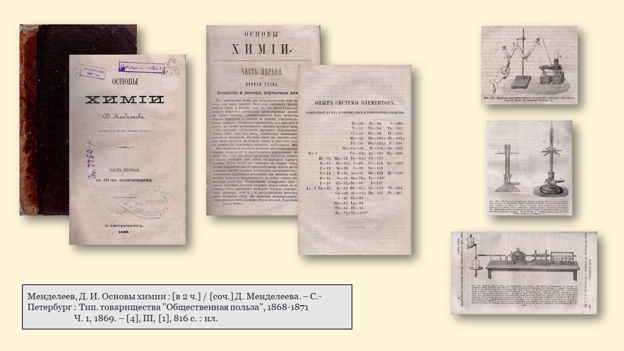 - Первое прижизненное издание классического труда Д. И. Менделеева «Основы химии» (1869 г.), в процессе работы над которым был открыт периодический закон химических элементов. Именно здесь впервые была опубликована знаменитая таблица элементов под названием «Опыт системы элементов, основанный на их атомном весе и химическом сходстве». Предисловие, написанное самим Менделеевым, придает этому изданию особую ценность. Учебник стал классическим руководством по неорганической химии, выдержал 13 изданий на русском языке и был переведен на английский, немецкий и французский языки.