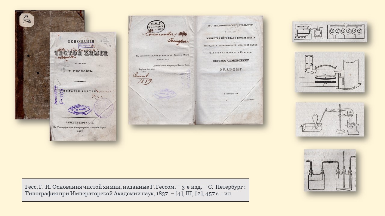 - «Основания чистой химии» Г. И. Гесса (1837 г.) – третье издание этого труда, в предисловии к которому автор пишет: «Цель моя состояла в том, чтобы, раскрывая пред глазами учащихся тесную связь между теорией и применением, возбудить в них уважение и любовь к науке». Эти слова актуальны и сегодня, напоминая о важности практического применения знаний.