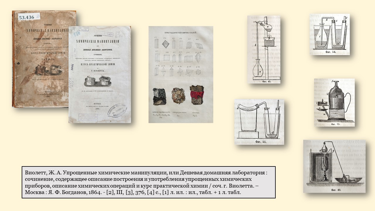 - «Упрощенные химические манипуляции, или Дешевая домашняя лаборатория» Ж. А. Виолетта (1864 г.) – эта книга, напечатанная в Москве, имела целью облегчить изучение химии и экономно проводить химические опыты.