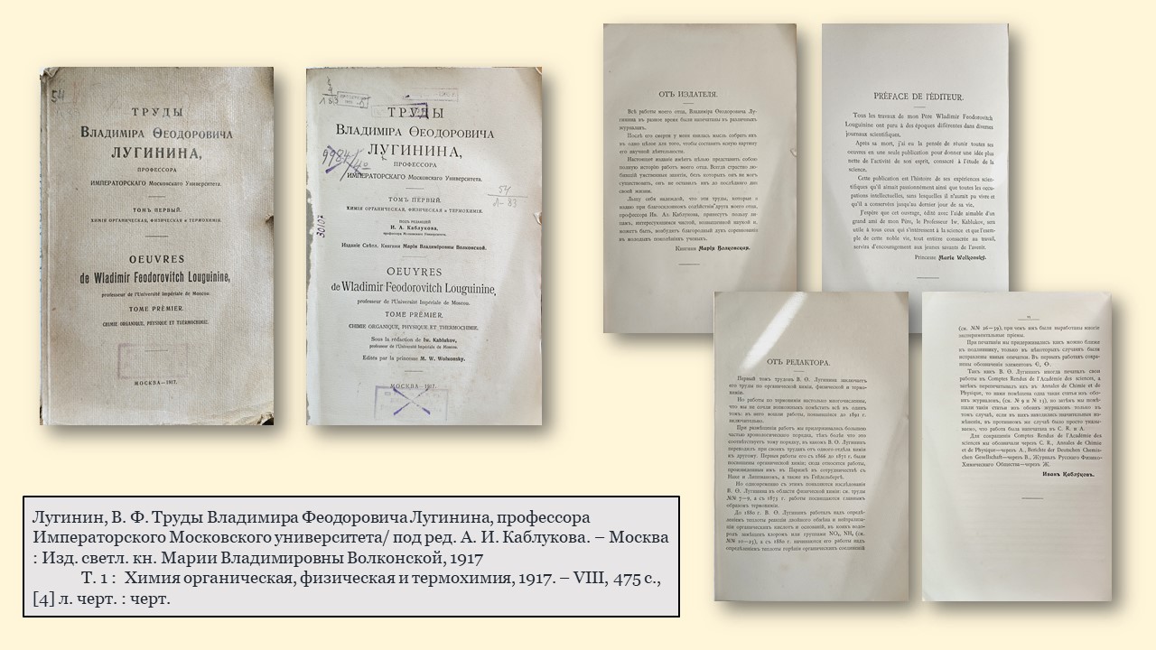 - «Труды Владимира Феодоровича Лугинина, профессора Императорского Московского университета» (1917 г.) – издание, осуществленное дочерью Владимира Федоровича, светлейшей княгиней Марией Владимировной Волконской. В нем собраны все работы профессора, опубликованные в разное время. Мария Волконская писала: «Льщу себя надеждой, что эти труды, принесут пользу, лицам интересующимся чистой, возвышенной наукой, и может быть возбудят благородный дух соревнования в молодых поколениях ученых».