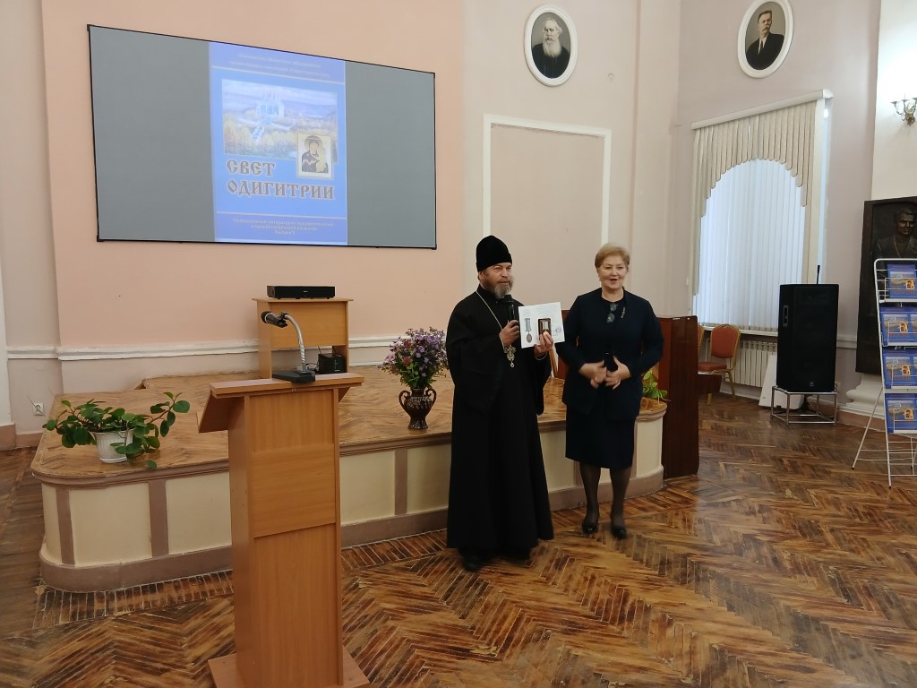 Руководитель комиссии Смоленской епархии по православным библиотекам и кафедрам православной литературы, митрофорный протоиерей Свято-Успенского кафедрального собора Михаил Горовой выступил с докладом “Кафедры православной литературы - центры популяризации книжной культуры и духовно-нравственного просвещения читателей”.
