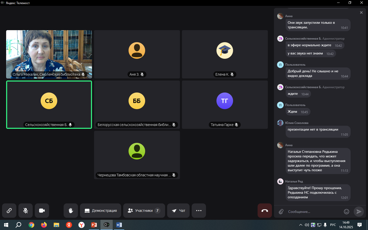 Наша коллега, Ольга Михайловна Михалик, сотрудник отдела редких книг, приняла участие в международной онлайн-конференции «Научные библиотеки в цифровом обществе: проблемы, перспективы, инновации, технологии», которая проходила в Центральной научной сельскохозяйственной библиотеке.