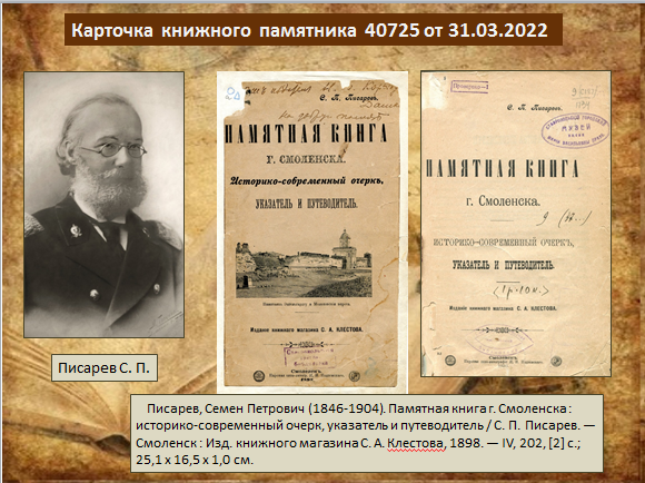Доклад Ольги Михайловны был посвящен уникальным смоленским изданиям XIX – начала XX веков. Среди представленных книжных памятников были работы, выпущенные в Смоленске Иваном Сытиным, труды видных смоленских историков, таких как Никифор Мурзакевич, Семен Писарев и Василий Грачев, а также книги с автографами и другие ценные экземпляры.