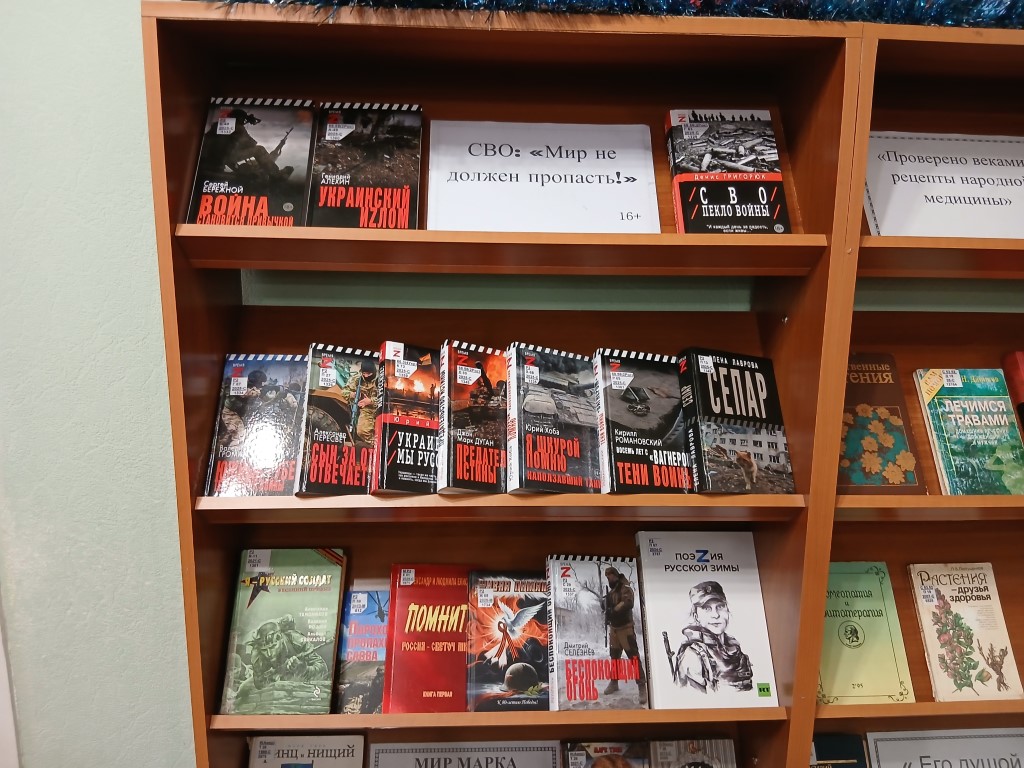 Сегодня военнослужащие Российской армии, выполняя боевую задачу, проявляют мужество и героизм, защищают свой народ от нацистов. В поддержку участников специальной военной операции в отделе абонемента оформлена тематическая выставка СВО: «Мир не должен пропасть!», на которой представлены художественные и поэтические произведения.