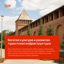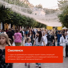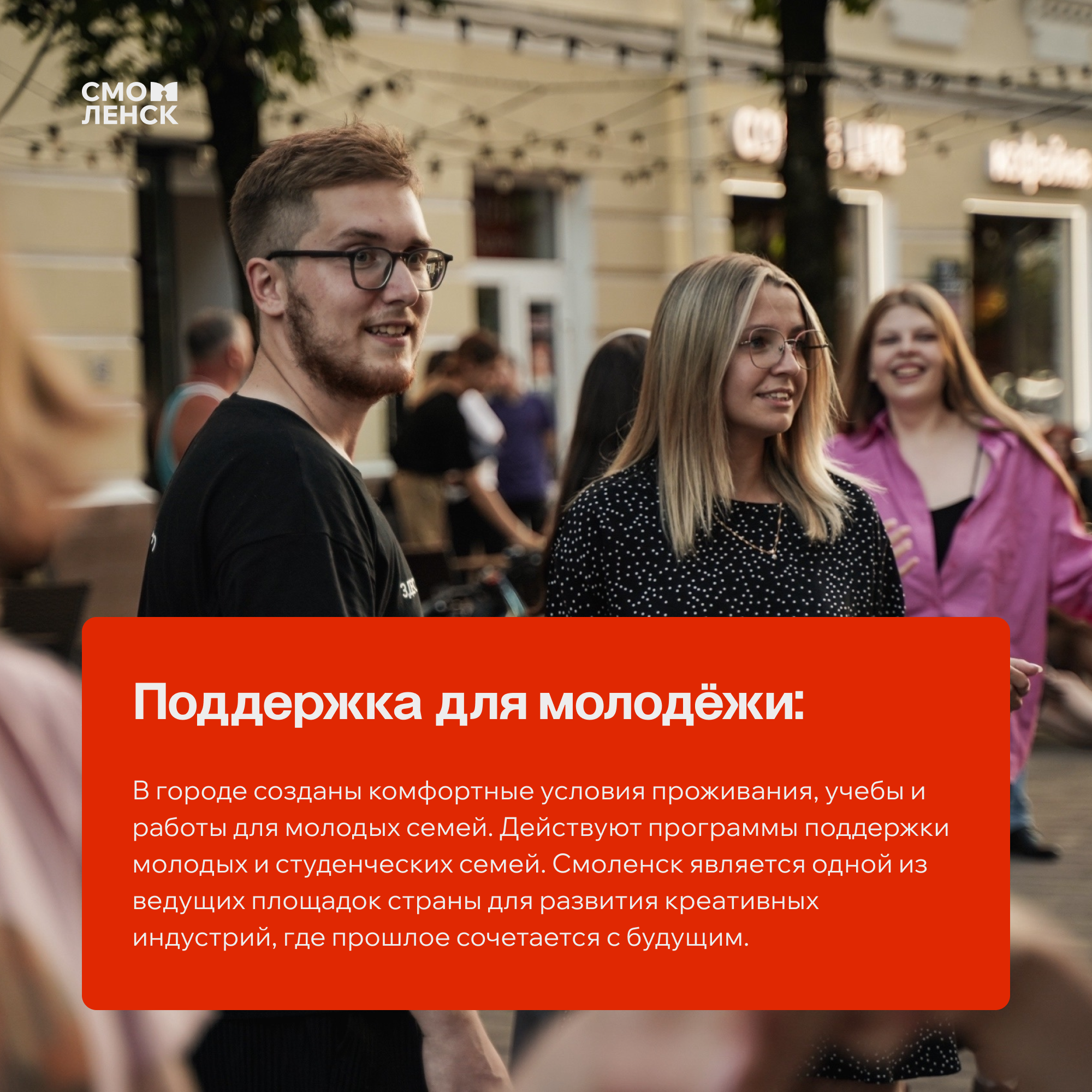 Сегодня Смоленск — это современный город с развитой городской и туристической инфраструктурой, где из любой его точки можно добраться до нужного места всего за 20 минут. У нас созданы комфортные условия для жизни, учебы, работы, творчества и спорта. Действуют программы поддержки молодых специалистов и студенческих семей.