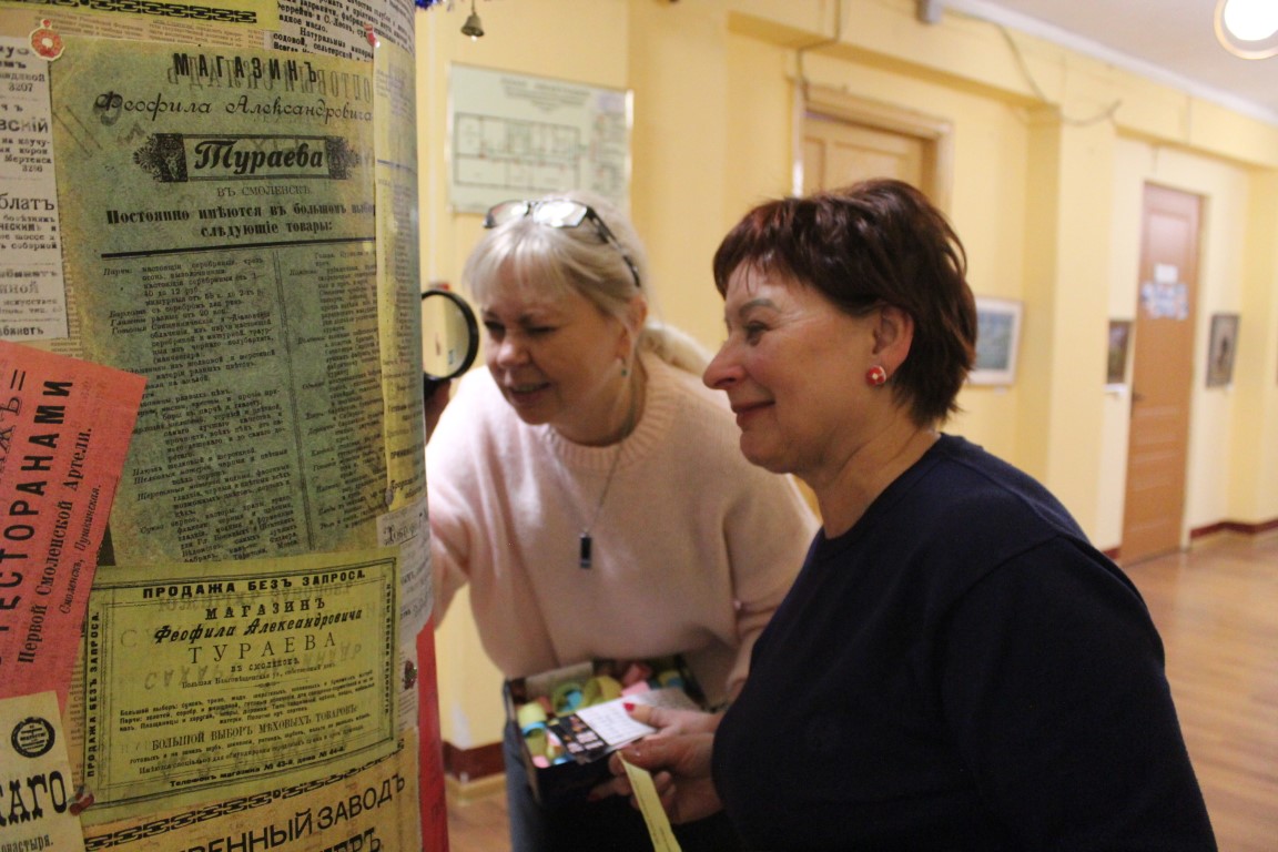 В холле, ведущем к редкому фонду, располагалась тумба с цветными рекламными объявлениями старого Смоленска до 1917 года. Эти объявления стали основой для познавательной и увлекательной викторины, вопросы которой позволили участникам погрузиться в историю своего города.