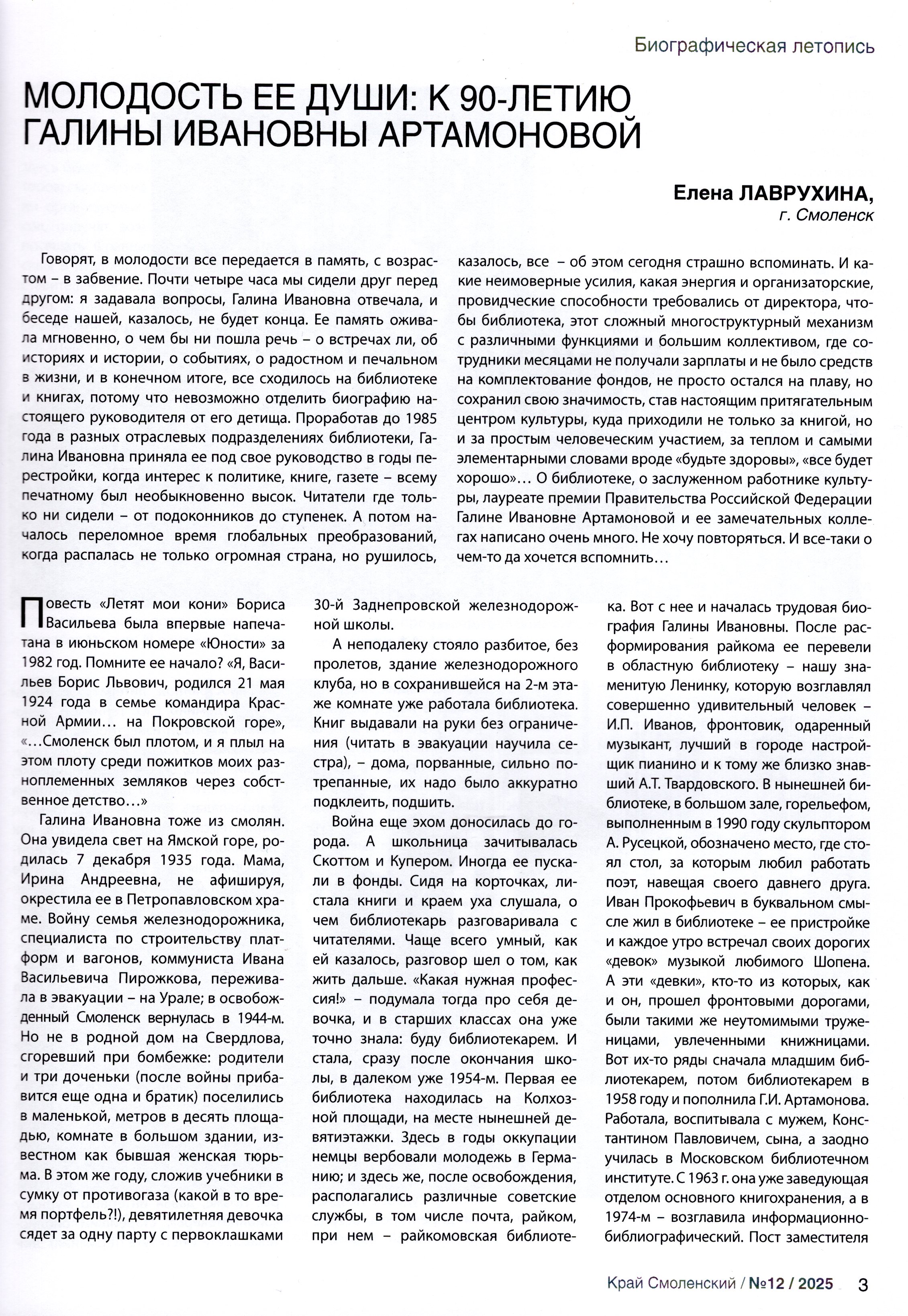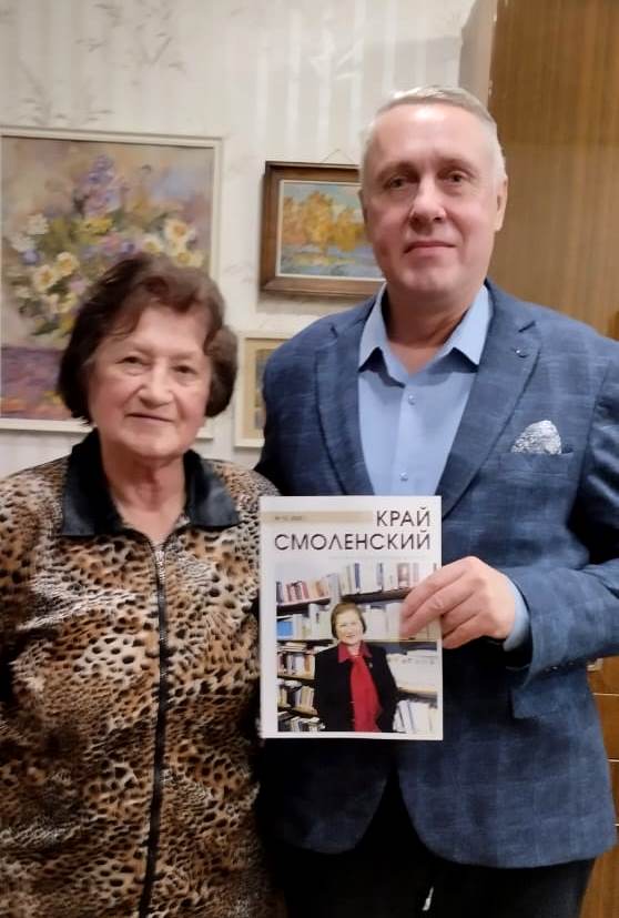 Вышел из печати новый, последний в этом году, номер журнала «Край Смоленский». Обложку украшает фотография нашего многолетнего директора библиотеки Галины Ивановны Артамоновой. Это не случайно – ведь в декабре ей исполнилось 90 лет. В честь этого знаменательного события первый материал журнала – проникновенный очерк Елены Лаврухиной «Молодость ее души».
