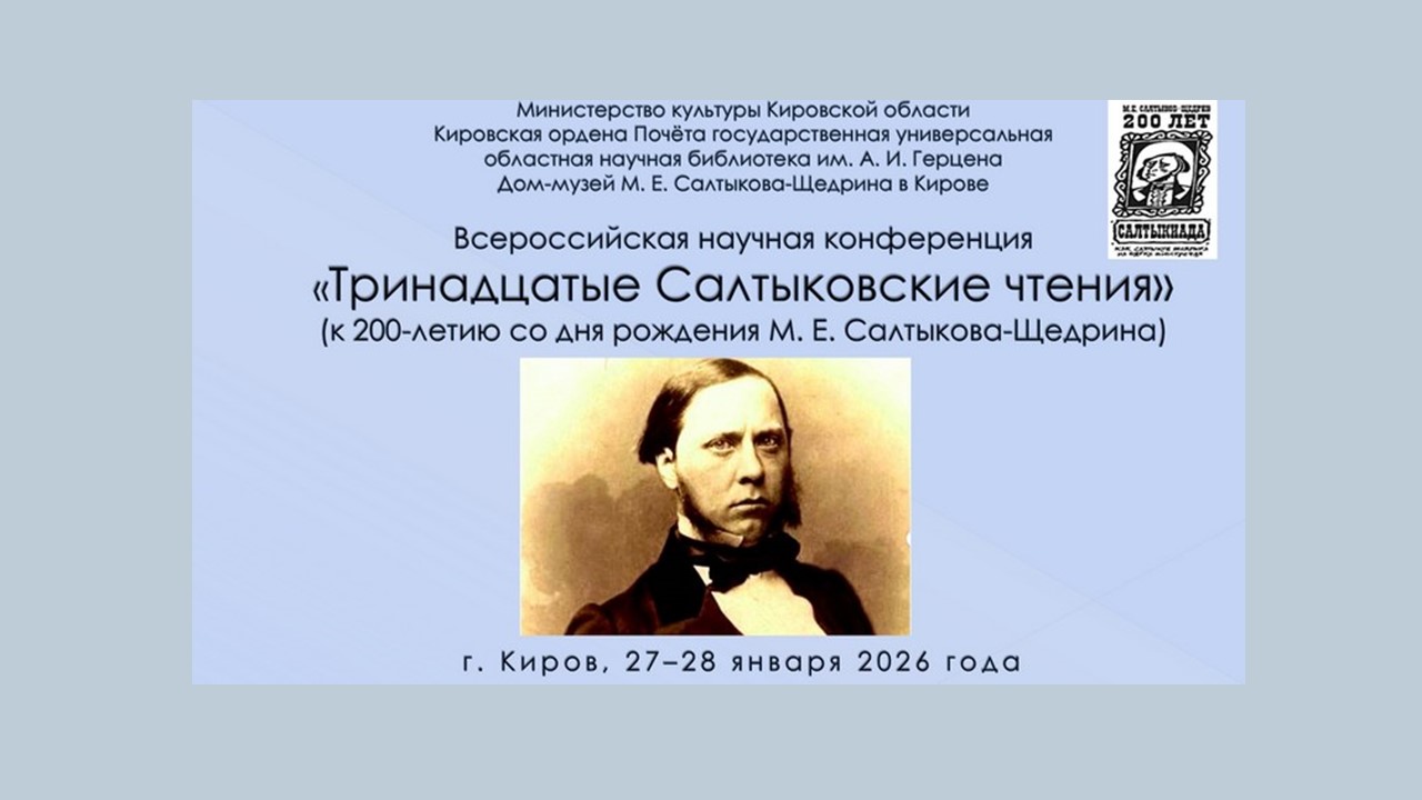 Сотрудники нашей библиотеки Елена Приставкина и Ольга Таршина приняли участие в посвященной 200-летию со дня рождения классика русской литературы Михаила Евграфовича Салтыкова-Щедрина (1826–1889) Всероссийской научной конференции «Тринадцатые Салтыковские чтения», прошедшей в Кировской областной научной библиотеке им. А. И. Герцена.