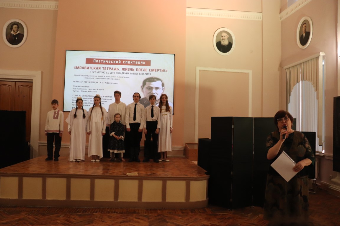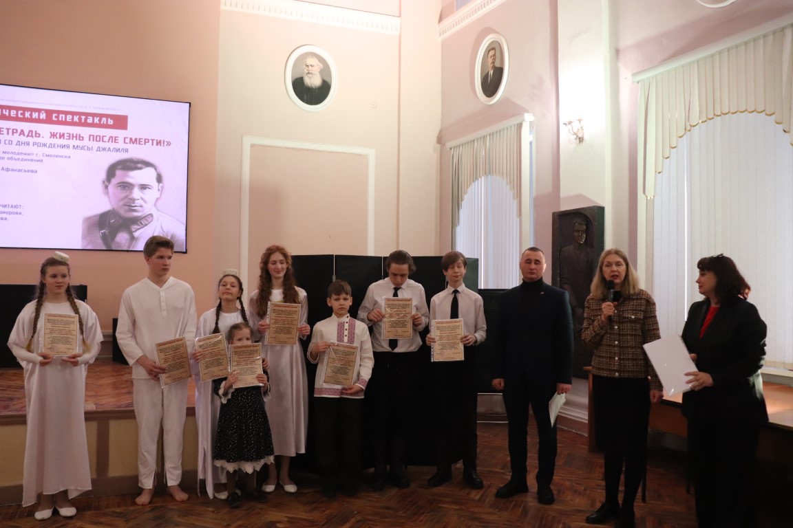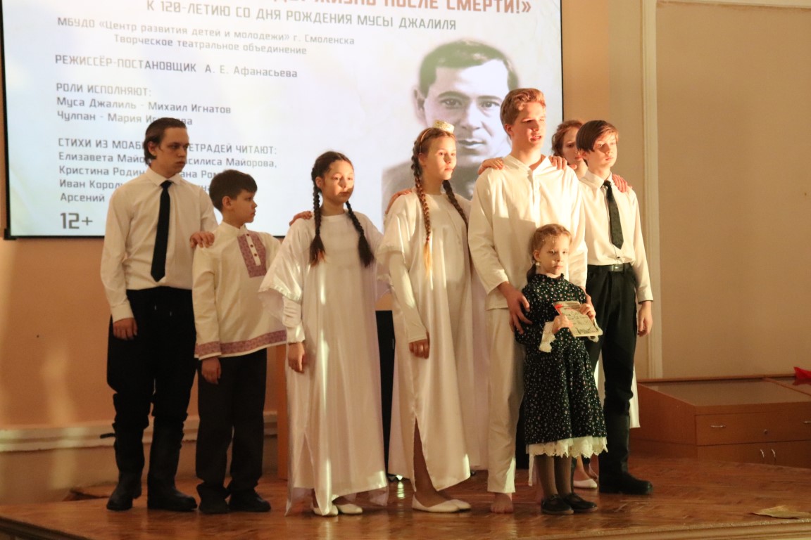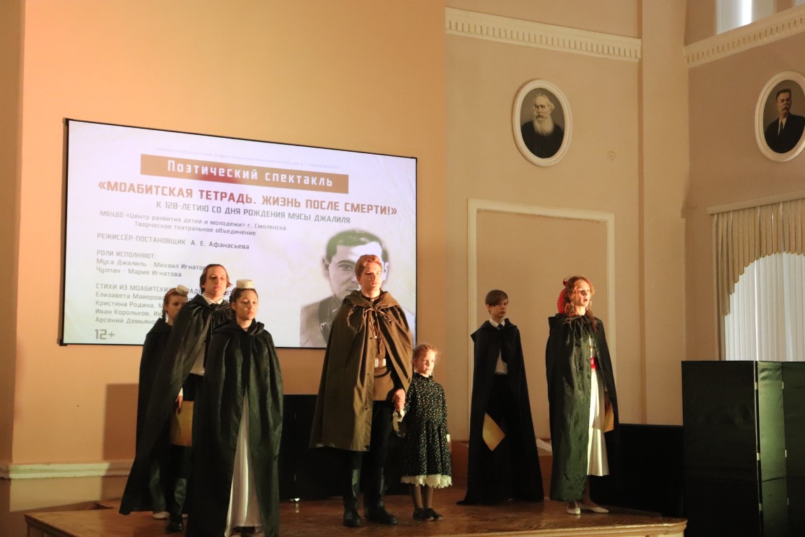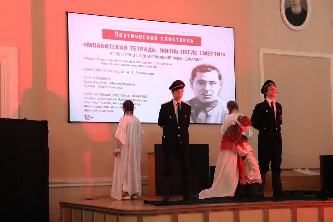 В библиотеке им. А. Т. Твардовского состоялась смоленская премьера поэтического спектакля «Моабитская тетрадь. Жизнь после смерти». Постановку, посвящённую 120-летию со дня рождения Мусы Джалиля, подготовили участники творческого объединения Центра развития детей и молодёжи, режиссёр-постановщик – Алевтина Афанасьева. Со сцены прозвучали стихотворения, созданные поэтом в годы Великой Отечественной войны и во время его заключения в тюрьме.