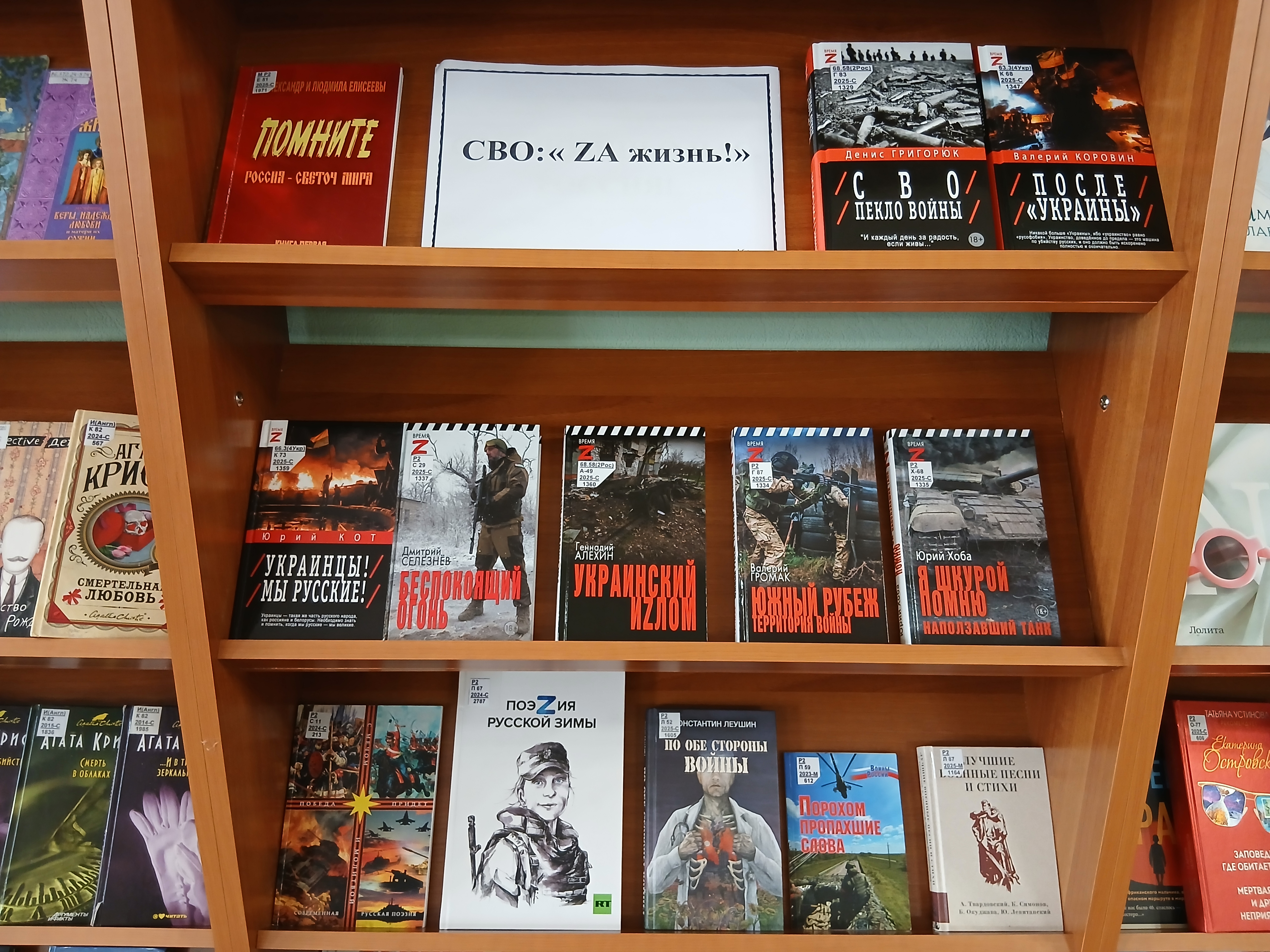 Сегодня военнослужащие Российской армии, выполняя боевую задачу, проявляют мужество и героизм, защищают свой народ от нацистов. В поддержку участников специальной военной операции в отделе абонемента оформлена тематическая выставка СВО: «ZА жизнь!», н которой представлены художественные и поэтические произведения.