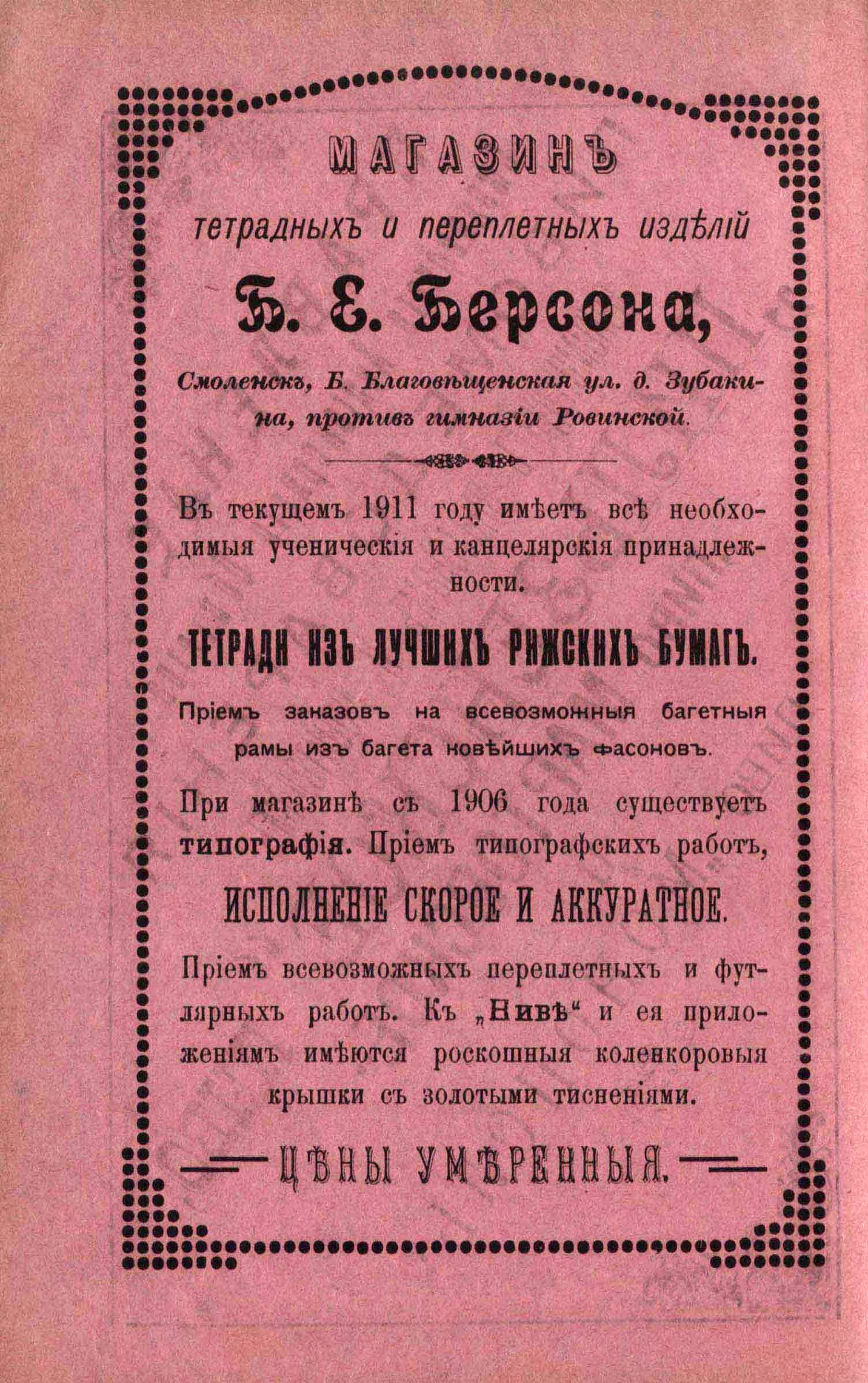 Берсон Б. Е., скоропечатня, магазин, переплетная мастерская
