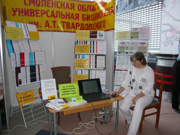 В том числе были представлены и информационные ресурсы библиотеки: Электронная библиотека диссертаций, научные работы областных конкурсов молодых ученых и студенческих научных работ, описания изобретений к патентам учебных заведений Смоленщины. Презентовали выставку заведующая отделом Гречишникова О.П. и библиотекарь сектора электронной библиотеки диссертаций Сухотина В.И.