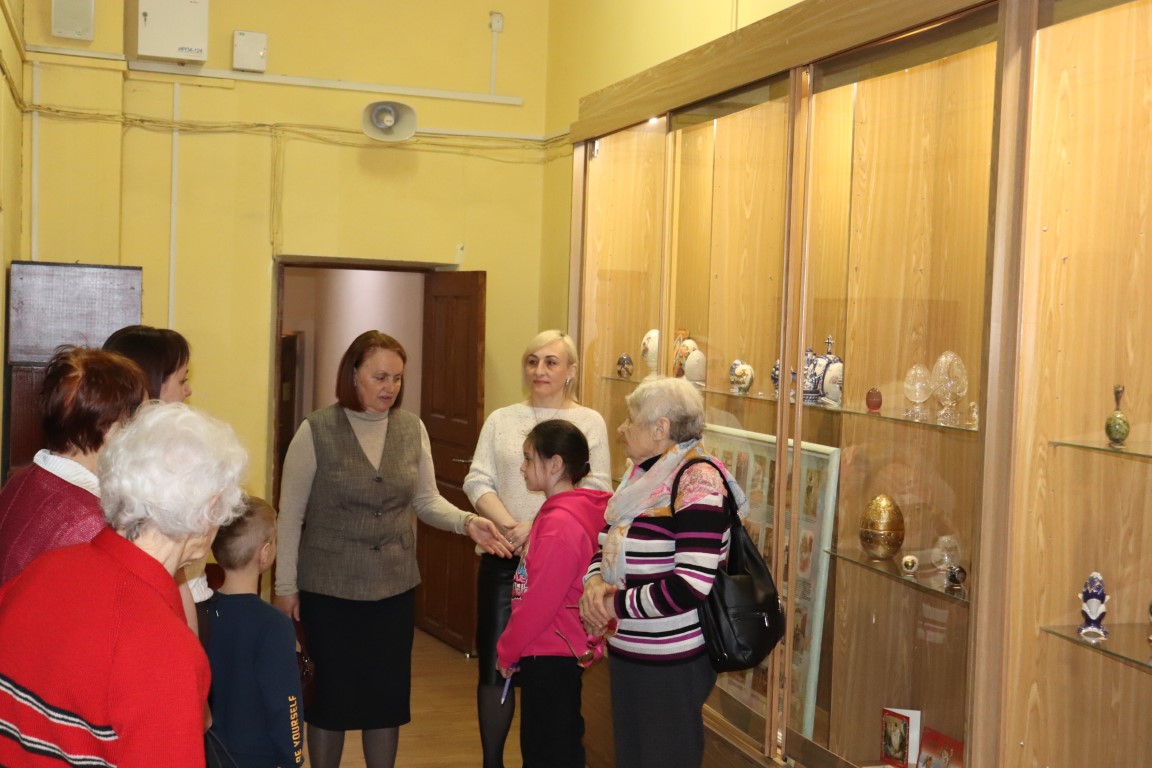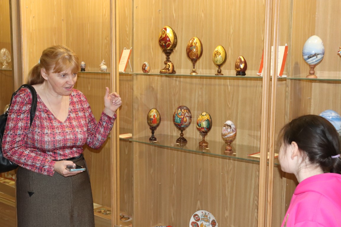 Сотрудники библиотеки рассказали слушателям воскресной школы при Успенском кафедральном соборе об уникальных экземплярах коллекции пасхальных яиц, представленной на выставке. О нюансах росписи пасхальных атрибутов посетители выставки узнали от преподавателя иконописи воскресной школы Натальи Исаевой.
