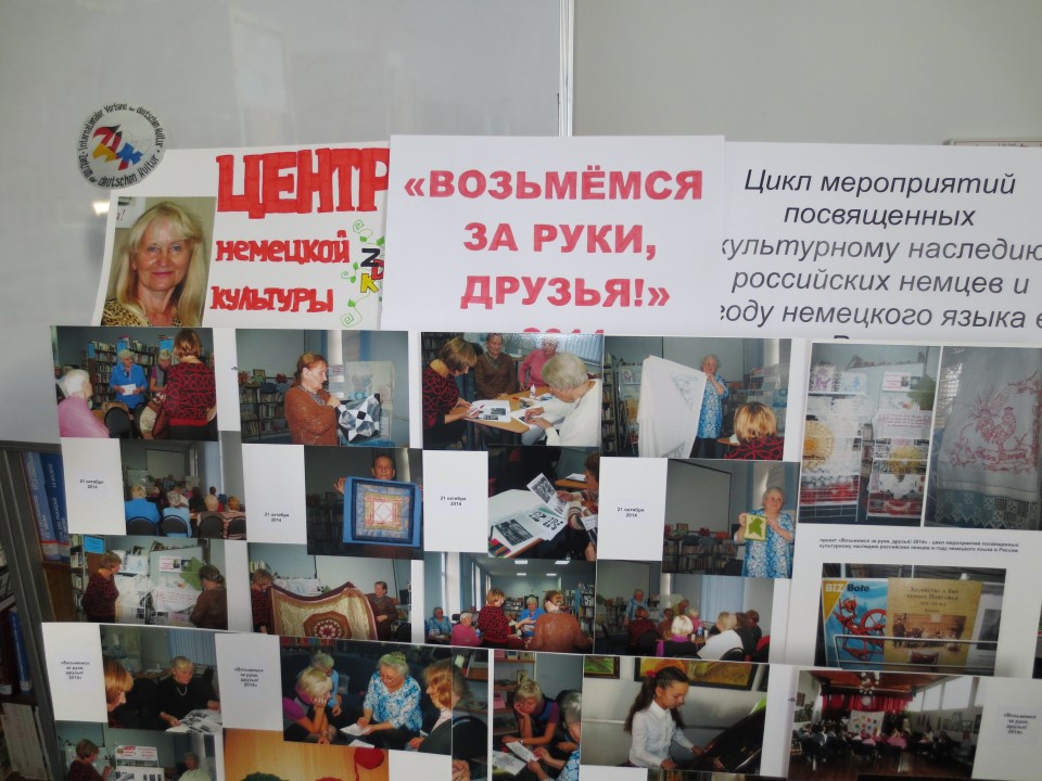 С 21 октября по 22 ноября 2014 г. в секторе литературы на иностранных языках при участии национальной общественной организации Центр немецкой культуры состоялся цикл мероприятий в рамках проекта «Возьмемся за руки, друзья!», посвященного культурному наследию российских немцев и году немецкого языка в России.