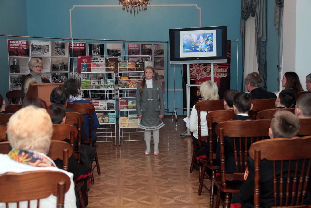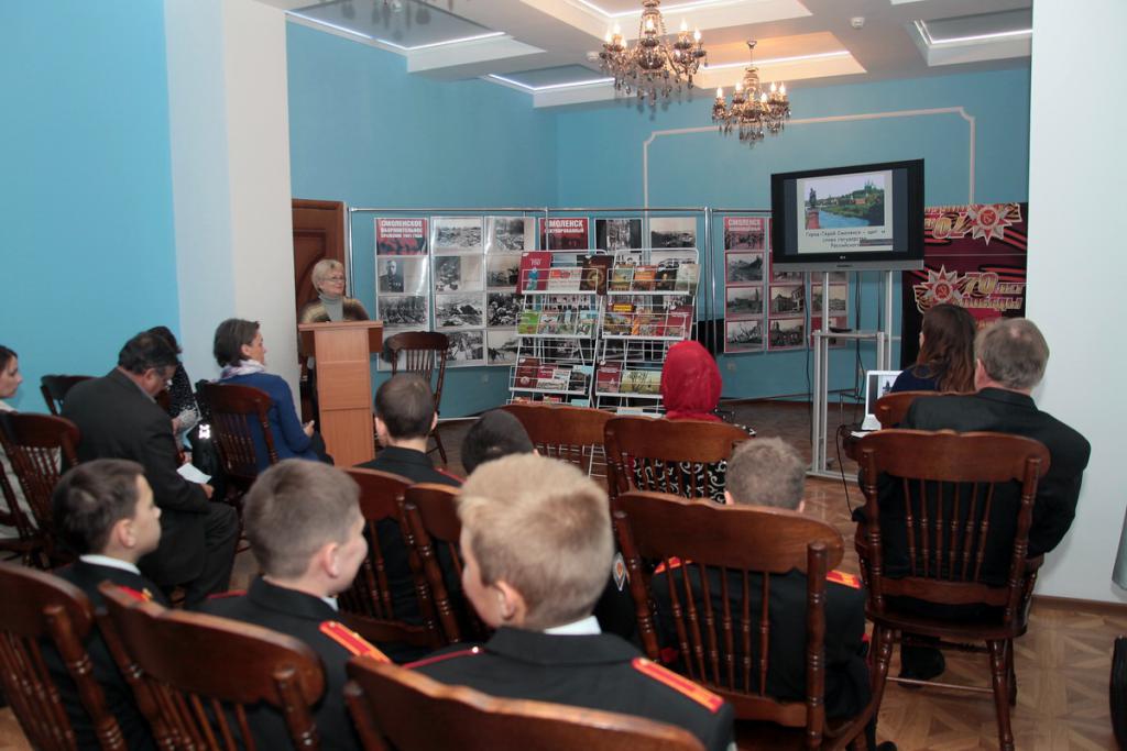27 сентября в Смоленской областной универсальной библиотеке им. А.Т. Твардовского состоялся литературно-музыкальный вечер «Город-герой Смоленск - щит России», приуроченный ко Дню города и 73-ей годовщине освобождения от немецко-фашистских захватчиков. Ведущая вечера, заведующая сектором литературы на иностранных языках отдела общего обслуживания, Р. Л. Тарасевич рассказала обучающимся Смоленского фельдмаршала Кутузова кадетского корпуса и средних общеобразовательных школ города об истории Смоленска, который в годы тяжких испытаний всегда прикрывал собой Москву и всю Россию, о смолянах, представителях разных национальностей, вносящих свой вклад в процветание нашего города.
