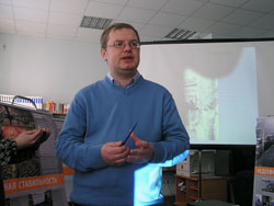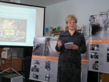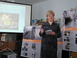 На презентации выставки диреткор Смоленской облатсной универсальной библиотеки Мальцева О.Е. рассказала о факторах, приведших к возникновению стены, и событиях связанных с празднованием 20-летнего юбилея.