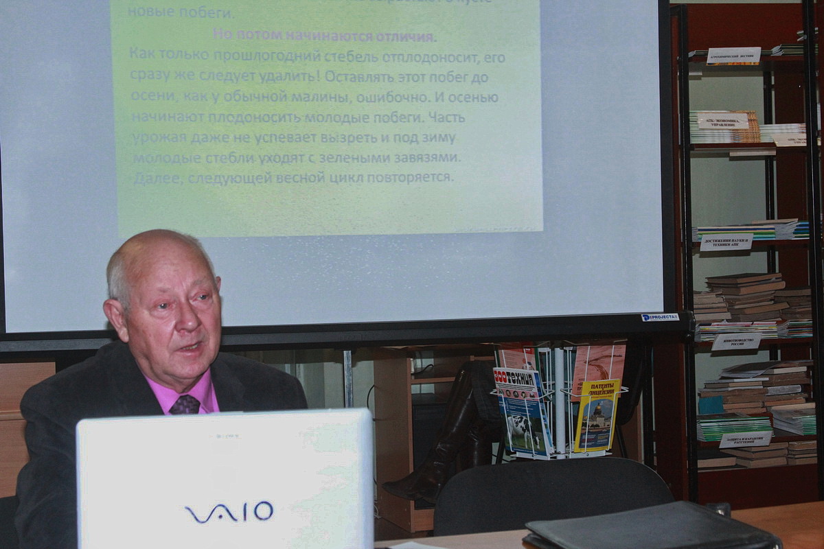 Во всех многочисленных тонкостях ухода за малиной членам клуба помог разобраться Вьюгин Сергей Михайлович, доктор сельскохозяйственных наук, профессор кафедры агрономии и экологии Смоленской ГСХА. Члены клуба имели возможность познакомиться с литературой, представленной на книжной выставке «Малина с июня до осени». Слушатели поделились своим опытом разведения малины и ухода за ней.