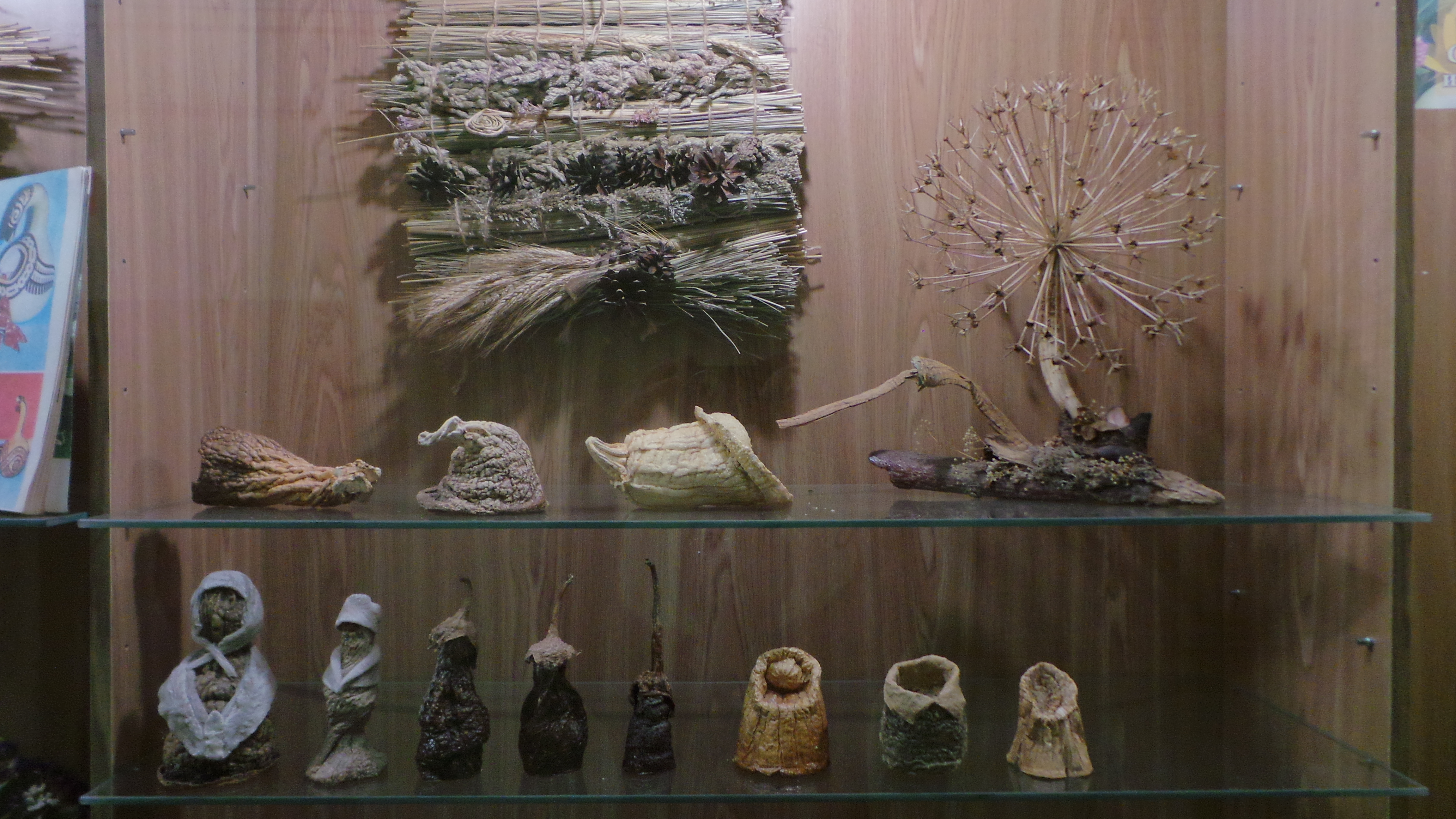 Рядом с работами мамы великолепно соседствуют очень симпатичные, искусно выточенные из дерева грибные композициии, выполненные сыном.
