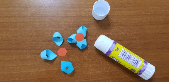 9. Положите красный кружок на стол и приклейте к нему голубые лепестки.