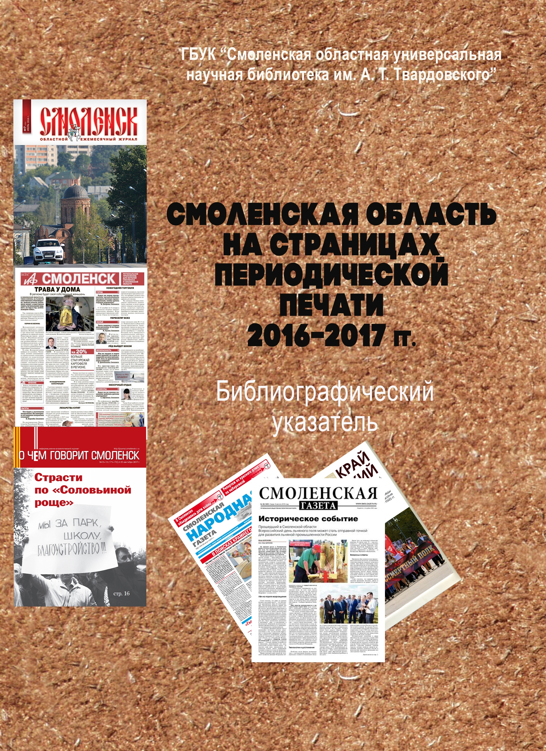 Смоленская область на страницах периодической печати : библиографический указатель / ГБУК "Смоленская областная универсальная библиотека им. А. Т. Твардовского". - Смоленск : [б. и.], 2009 - Вып. 6 : 2016-2017 гг. |