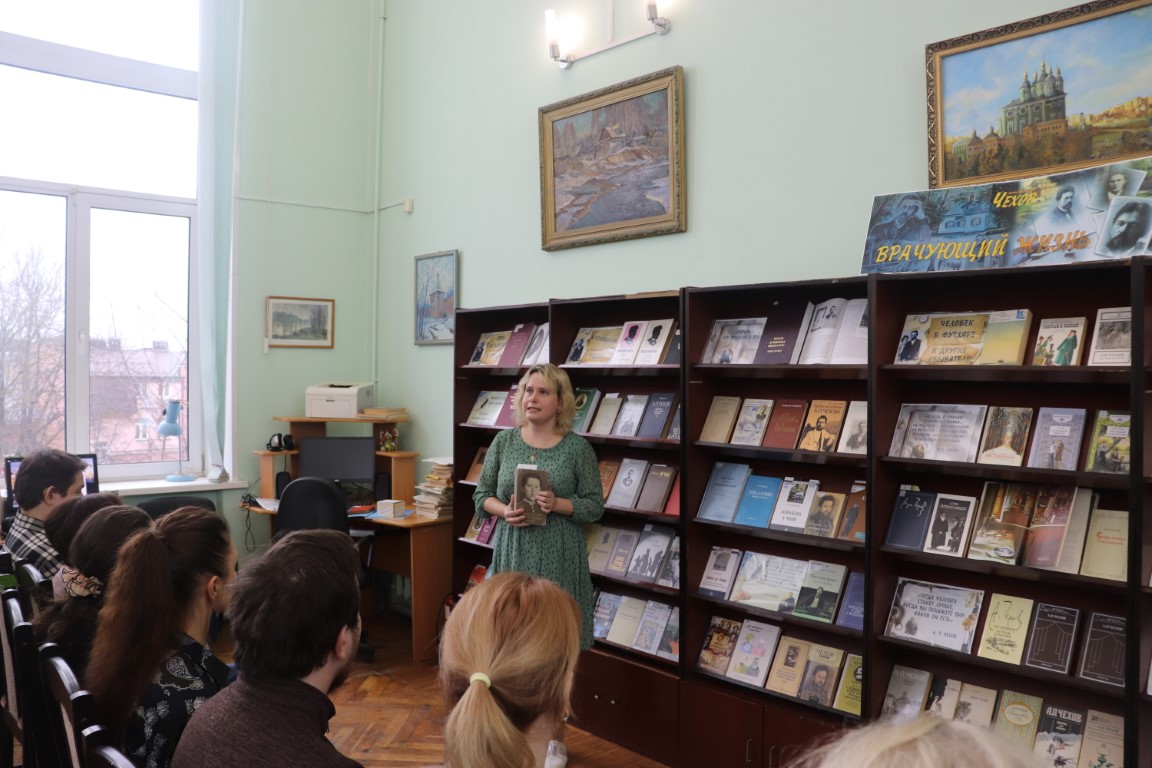 Слушатели познакомились с книгами, которые повествуют о судьбе великого писателя («Чехов» Г. П. Бердникова, «Антон Чехов» А. Труайя, «Антон Павлович Чехов» А. П. Чудакова, «Ваш Чехов» А. П. Кузичевой, «Жизнь Антона Чехова» Д. Рейфилда и др.). Книги А. Б. Дермана «О мастерстве Чехова», А. П. Чудакова «Мир Чехова», Н. А. Кожевниковой «Стиль Чехова» и другие открыли для слушателей творческую мастерскую писателя и драматурга. Чехов – талантлив (кто же в этом сомневается?). Но еще больше потрясает его трудолюбие и душевная щедрость. В книге «О Чехове» К. Чуковский писал, что Чехов помогал людям так неутомимо и деятельно, словно был не человек, а учреждение!