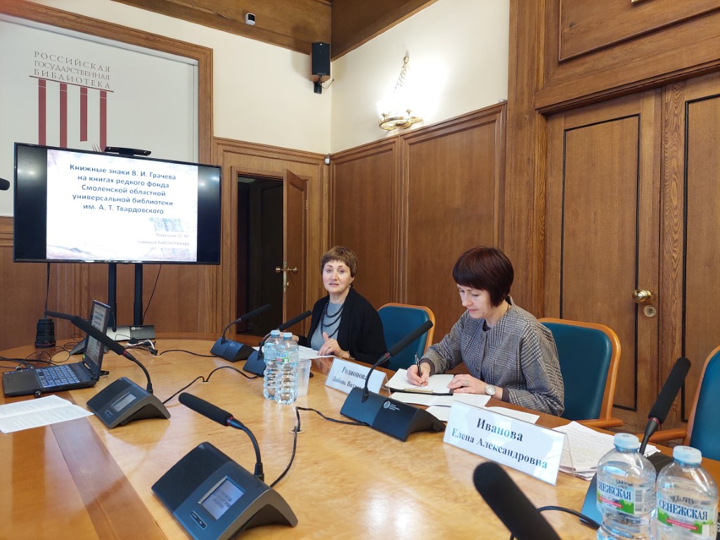 Доклад Ольги Михалик был посвящен смоленскому историку и краеведу Василию Ивановичу Грачеву, а также его книжным знакам — штемпелям и дарственным записям на книгах из редкого фонда нашей библиотеки.