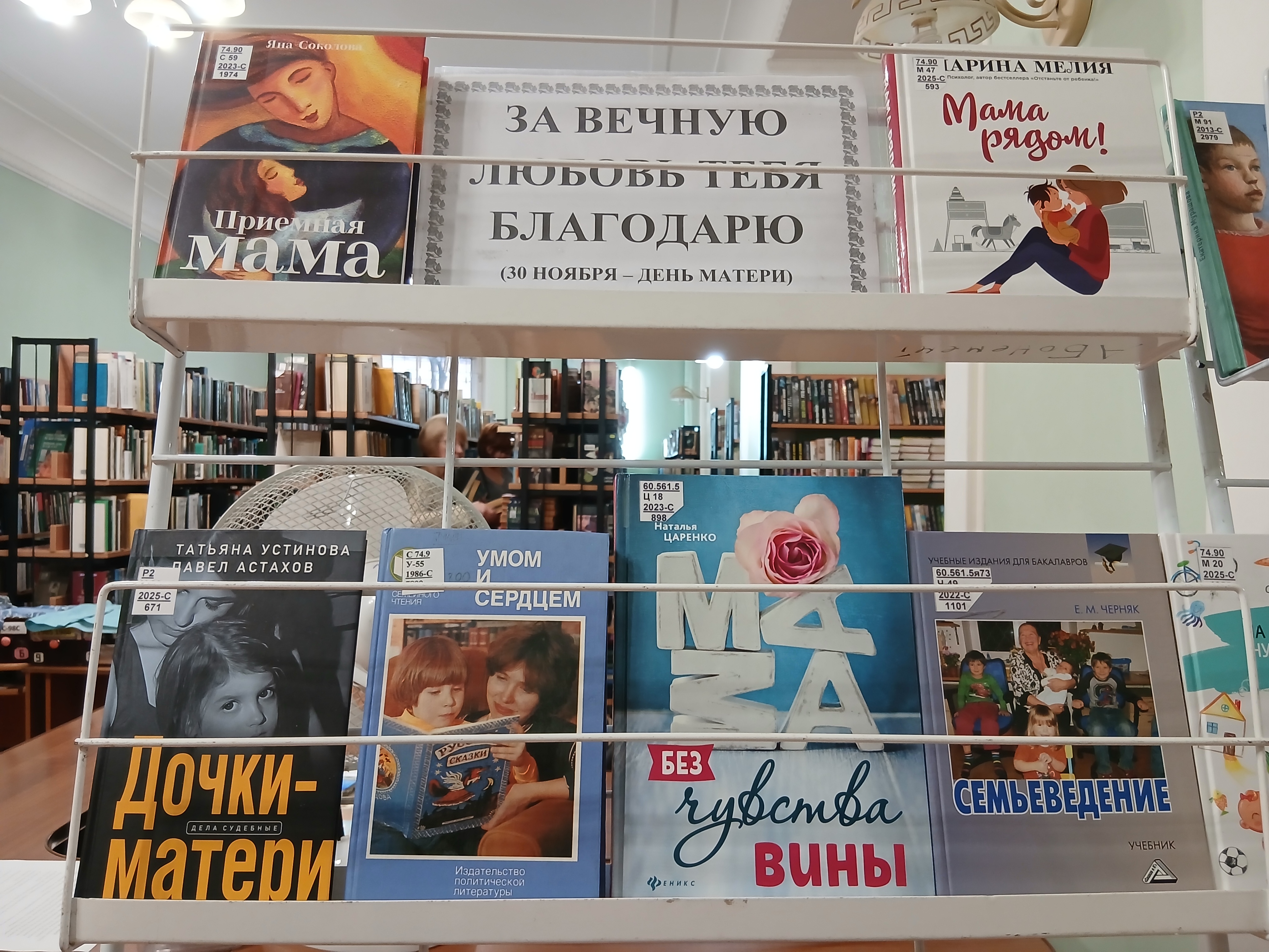 В отделе абонемента к этому дню подготовлена выставка «За вечную любовь тебя благодарю», на которой представлены книги, с которыми воспитание детей станет проще. Для будущих мам представлены книги с советами по воспитанию и проведению досуга с детьми разных возрастов, научно-популярные издания по психологии детей и родителей. Также подобраны добрые, искренние и интересные художественные произведения, посвященные самому дорогому человеку – маме.