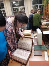 Во время Библионочи посетители редкого фонда смогли окунуться в мир уникальных изданий. Им были представлены факсимильные копии таких шедевров, как «Радзивиловская летопись» и «Слово о полку Игореве». Особый интерес вызвали произведения Пушкина, среди которых было миниатюрное издание «Евгения Онегина» в кожаном переплете и золотым обрезом, поэма «Медный всадник» с иллюстрациями Александра Бенуа, а также книги для детей – «Азбука Бенуа», созданная для сына автора с живописными картинами, красочные сказки издательства И. Н. Кнебель и мн. др.