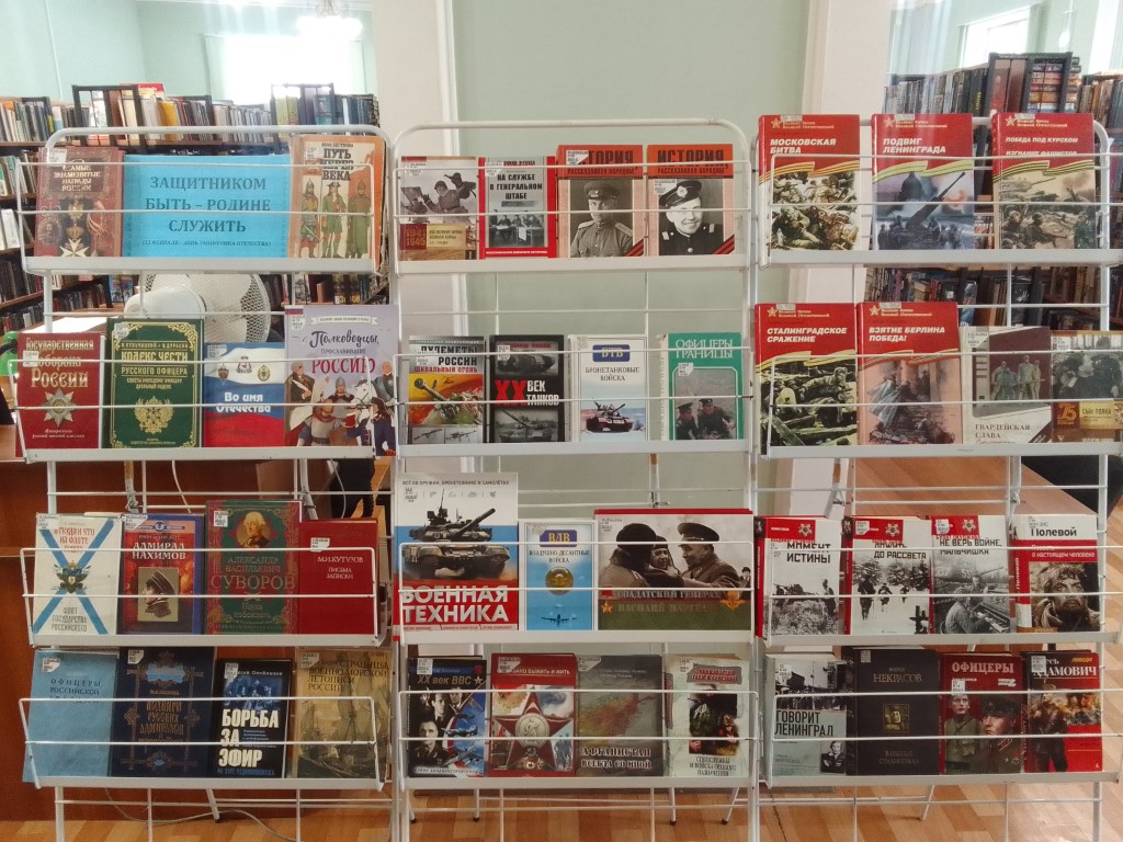 Ко Дню защитника Отечества в отделе абонемента экспонируется тематическая выставка «Защитником быть – Родине служить». Книги, представленные на выставке, помогут совершить исторический экскурс в героическое прошлое нашей страны, узнать о защитниках Отечества и славных именах и героях. Для выставки подобрана литература, отражающая мужество, благородство, честь и отвагу сильной половины человечества.