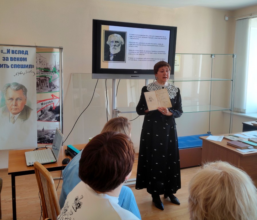 В стенах нашей библиотеки вновь собрались участники смоленского книжного клуба «Книгини» для очередного литературного погружения. На этот раз темой встречи стал великий русский писатель Иван Сергеевич Тургенев, а в центре внимания оказались его знаковые романы – «Отцы и дети» и «Дым».