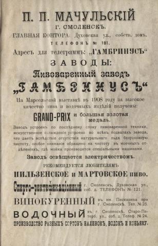 В конце 19 – начале 20 в. реклама в печатных изданиях стала заметным явлением в жизни Смоленска и Смоленской губернии. Издатели того времени отдавали под рекламу значительное место в периодических и справочных изданиях. В 1900 г. началась публикация платной рекламы в «Памятных книжках Смоленской губернии». Размещалась реклама и во всех популярных в то время путеводителях по Смоленску.